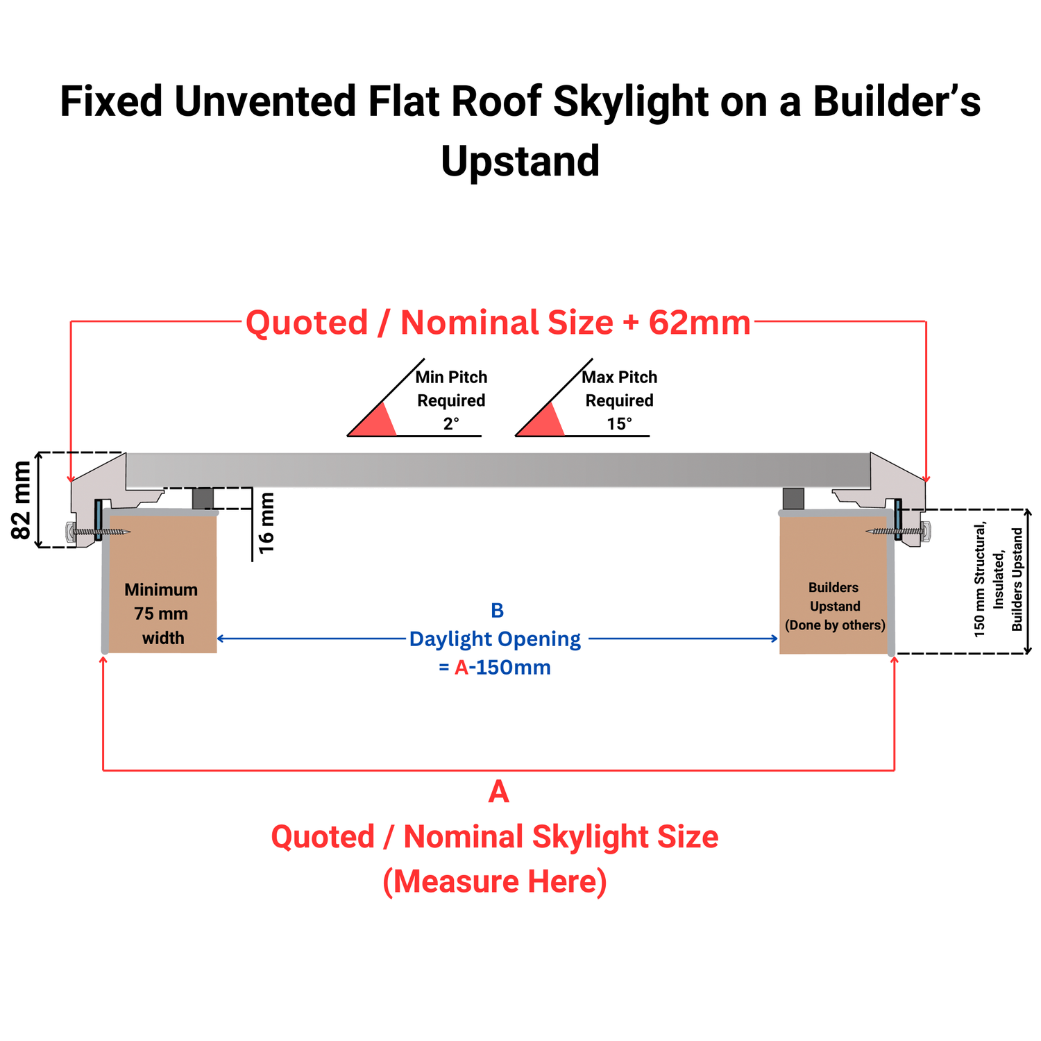 1200 x 1200 mm Brett Martin Fixed Flat Roof Skylight - Builders Upstand / Unvented is Available.