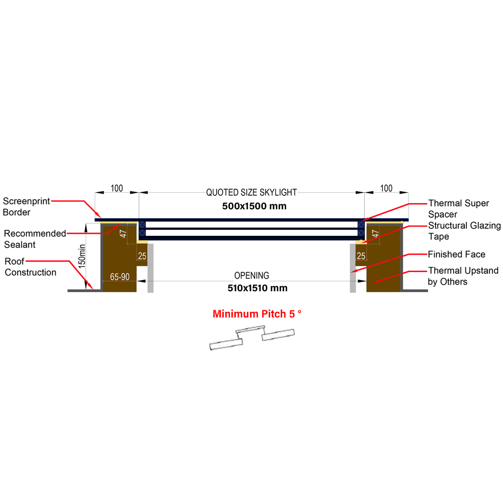 We recommend the upstand to have a minimum of 6 degree pitch (preferably on the short side) to avoid water pooling in the middle of the unit which would mean roughly 10 cm for every 1 linear meter of skylight. For instance, a 1000 x 2000 mm unit would require one end of the upstand to be 10 cm higher than the other if skylight pitched on the short side and 20 cm higher if pitched on the long side.