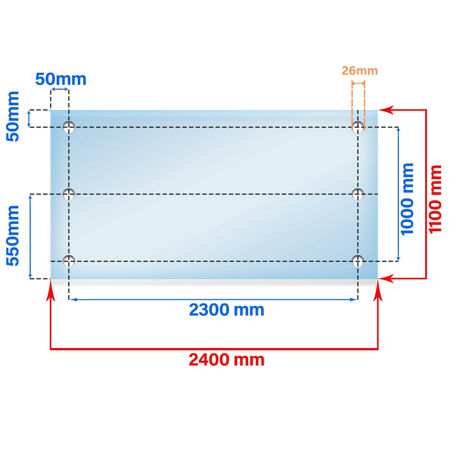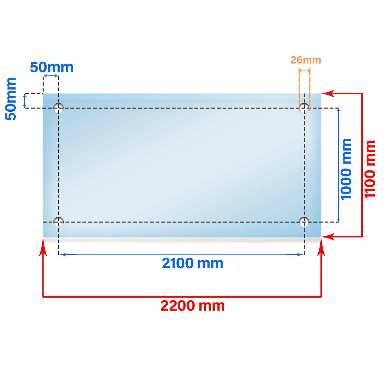 The fixing centres, which are the points where the balcony will be anchored, should be considered next. In the example of a 2300mm wide glass, the fixing centres would typically be set at 2200mm apart.