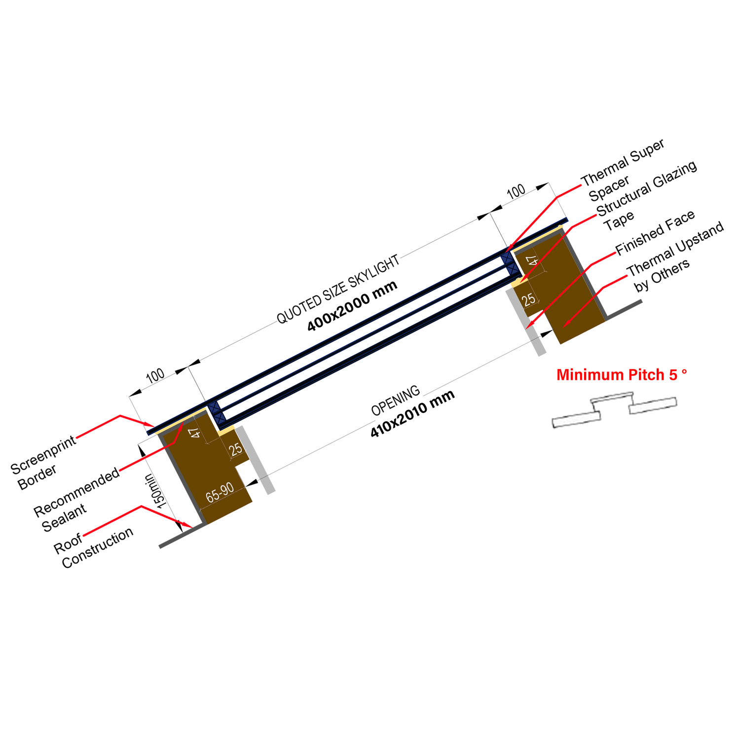 We recommend the upstand to have a minimum of 6 degree pitch (preferably on the short side) to avoid water pooling in the middle of the unit which would mean roughly 10 cm for every 1 linear meter of skylight. For instance, a 1000 x 2000 mm unit would require one end of the upstand to be 10 cm higher than the other if skylight pitched on the short side and 20 cm higher if pitched on the long side.
