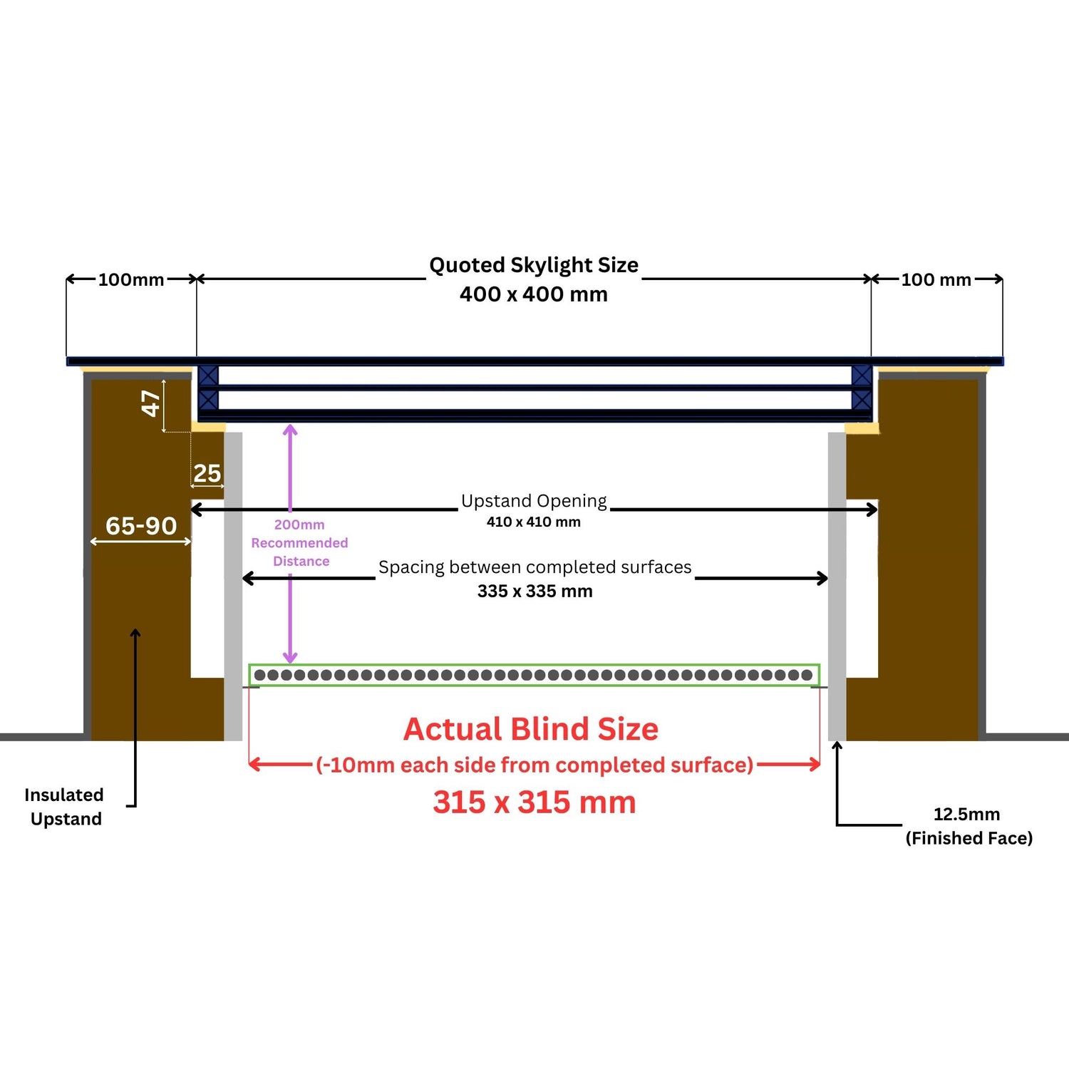 Please note, our off the shelf size blinds come 85mm smaller than the size selected. Assuming you’ve built your skylight per our recommendations, this is to account for the timber batten (25mm) and plasterboard (12.5mm) from each side thus leaving a 10mm gap for the blind to fit in.